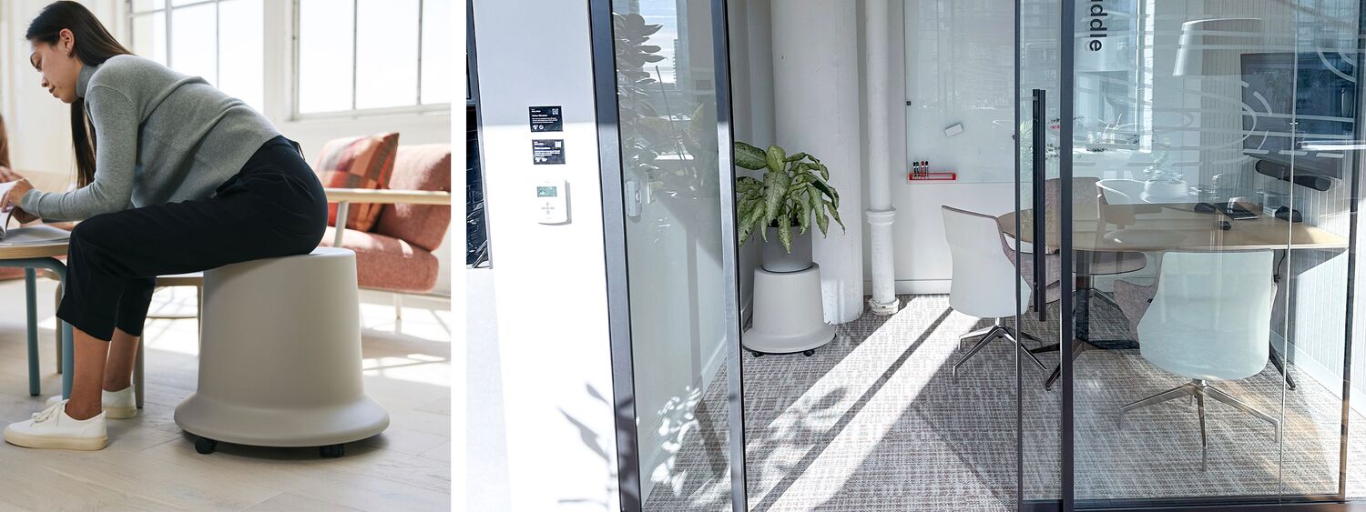 The design team tells us that repurposing furniture may require more upfront effort in sourcing and specifying, but the environmental benefits are substantial. While repurposing is not a new trend, environmentally conscious forward-thinking design firms like M Moser’s are pushing it forward into the world of contract furniture. A perspective we at Teknion are eager to support, and simplify the process wherever possible. For us, one notable highlight from the Living Lab’s rehomed furniture line up are the Teknion Routes Multi-Use Stools, affectionately called "top hats" by M Moser. These mobile stools serve multiple purposes in the space: seating, plant holders, team-building game pieces, and even turned upside-down to be drink coolers at events. Once props at a photoshoot, we quite enjoyed seeing them with new life and unexpected uses.